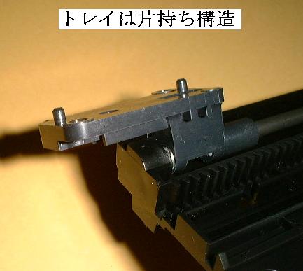 モールド部品の下部が爪になっており、嵌め込むとロックするので2本のネジで固定します。 トレイを最前部へ出したままの状態で乗せます。 レール部は片持ち式で、90度以上回転して跳ね上がります。 あまり感心しませんが、傾くようなことはありません。 ギアASS’Yがトレイのラックギア側をスプリングで押さえる機構なので、ローコストを意識した設計でもないようです。 装着時にギアASS’Yを手で広げる必要があり、若干の注意が必要です。 ![]()